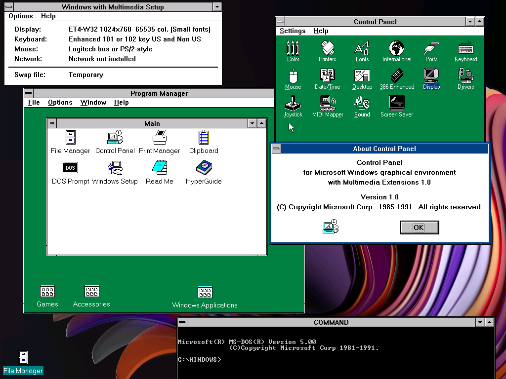 4. If you don't like the large UI (scrollbars, buttons, etc) in 1024x768x65536 mode, copy A:\FIX30\VGA4AHTX.DRV to C:\WINDOWS\SYSTEM (I've edited the resources using Borland Resource Workshop to make UI elements smaller).